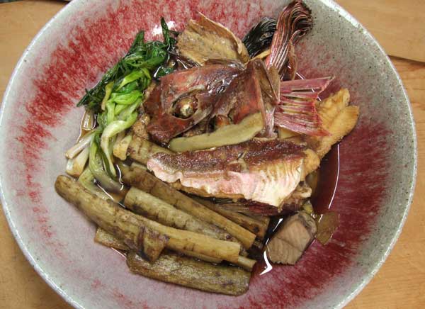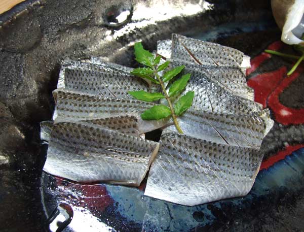 口に入れた途端、チカの皮目の香ばしさに地伝酒、醤油の香り、次に白身のキュウリのような香りと甘味がほんのり浮き上がる。と、そのまたまた次に旨味と繊維質のほどけるようなホロホロ感も楽しめるわけで、とにもかくにも短時間に口の中をチカの旨味が満たして消える。面白いのは、地伝酒と醤油を使うと「魚を食べただけではなく醸造香を味わった」ように思えることだ。