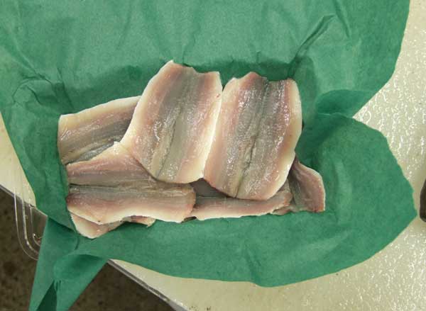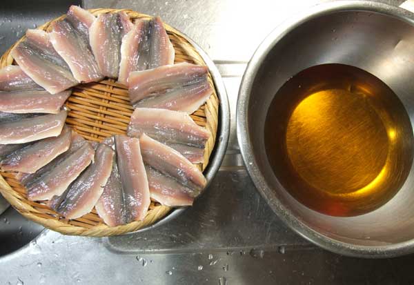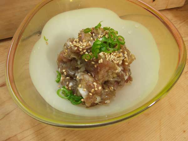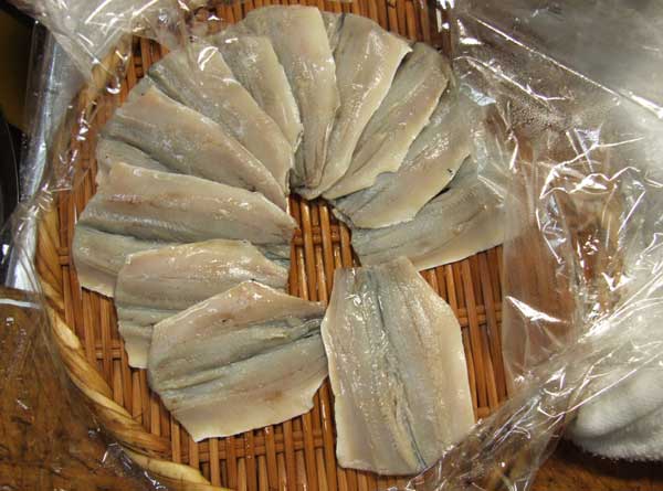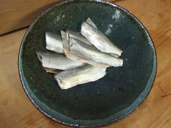 三枚に卸して、適度に薄皮を取り、皮目を直火であぶる。