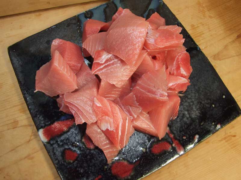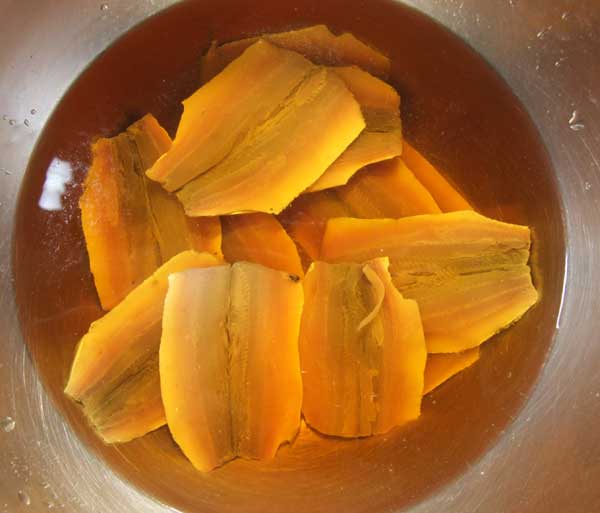 すぐに氷水に落として、後は簡単、ほどよい厚さに切りつける。