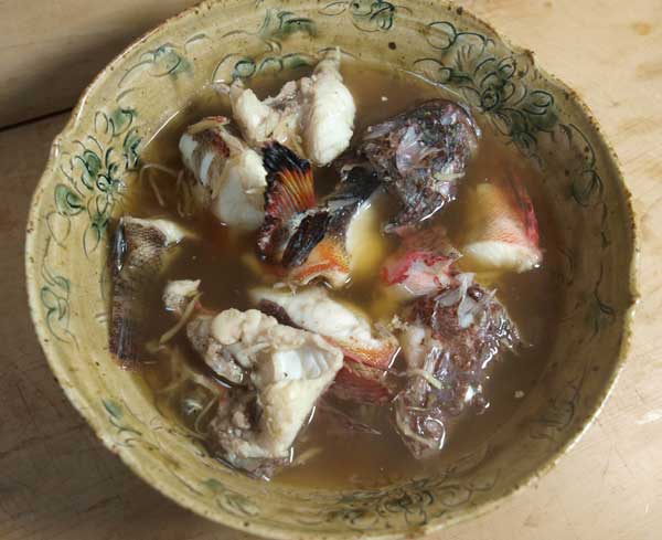 「へか焼き」は地魚を野菜、コンニャク、豆腐、海藻などと醤油味の汁で作る鍋物。